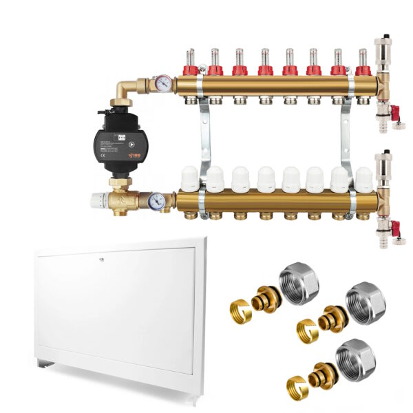 Dieses Messing Festwertregelset mit Hocheffizienzpumpe (HE-Pumpe) ist zur Verwendung in Anlagen mit niedriger/hoher Vorlauftemperatur geeignet.Es schließt eine Niedrigtemperatur-Flächenheizung an eine bereits bestehende Hochtemperatur-Anlage an und versorgt beide Heizkreise durch einen gemeinsamen Strang.Dieses Set ist montagefertig und für einen rechts- oder linksseitigen Anschluss an den Heizkreisverteiler geeignet.Hiermit kann die Regelung der Vorlauftemperatur auf einen vorgewählten festen Sollwert (30 – 50 °C) erfolgen.Die Armaturengruppe besteht aus einer hocheffizienten Umwälzpumpe, einem Thermostatventil mit Fernfühler, einer Rücklauf-Verschraubung, einem Sicherheitstemperaturbegrenzer, einem Thermometer, einem Füll- und Entleerungshahn und einem Entlüftungsventil.Die Verteileranschlüsse sind flachdichtend.